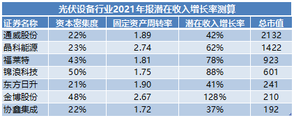 光伏设备潜在收入增长率较大的公司有通威股份、晶科能源、福莱特、锦浪科技等。其中晶科能源应该是四家光伏组件上市公司中资本开支最激进的,2021年的资本密集度为23%。
