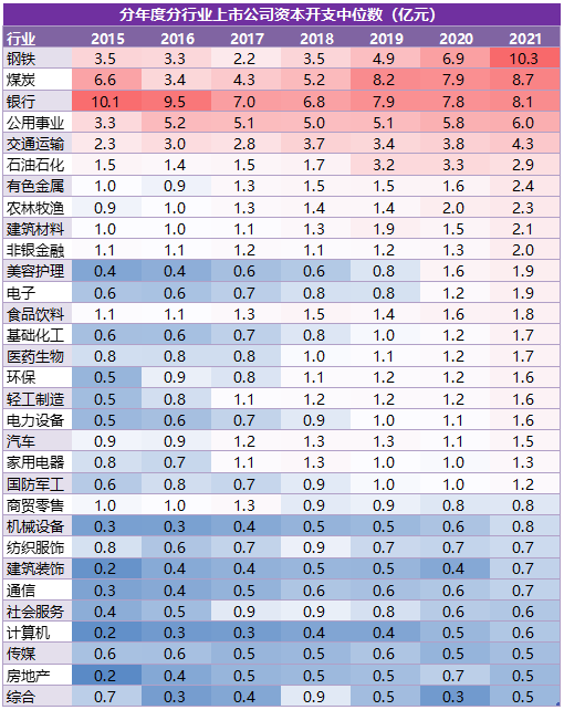 毋庸置疑,资本开支的体量跟行业紧密相关。钢铁煤炭这些重资产行业天生就需要较高的资本开支,传媒、计算机这些轻资产的行业,资本开支相对就要低一些,或者说,企业扩张的驱动力并不体现在资本开支上。