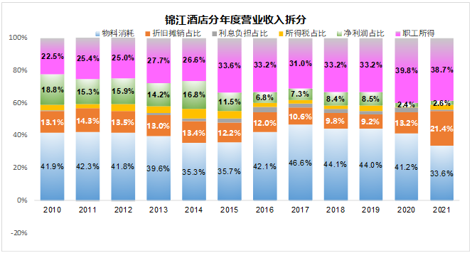 锦江酒店这些年折旧摊销一般都能占到营业收入的10%左右,员工薪酬则占到30%,首旅酒店的表现与锦江基本一致。