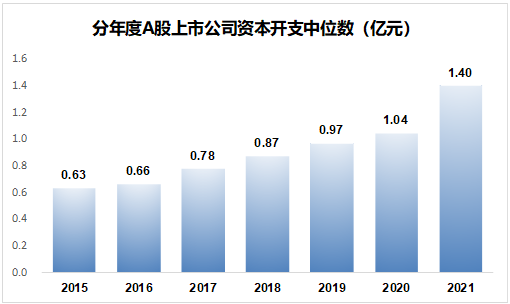 我们查阅了A股上市公司过去7年的数据,从中位数的角度来说,上市公司资本开支总体上是逐年上升的。2021年一家普通的上市公司,大概拿出1.40亿的资金去进行产能或者生产的扩张。这个1.40亿的数字,就是我们需要熟悉的财务背景。