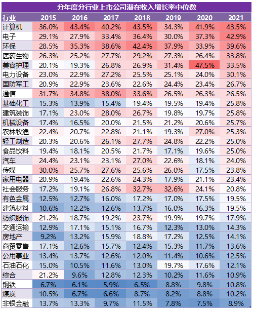 根据各个年度的数据,我们推算出的全部上市公司收入潜在增长率的中位数如上图。总体上看,这个数字基本上在20%-26%之间,2021年这个数据稍有跳升,为25.8%。