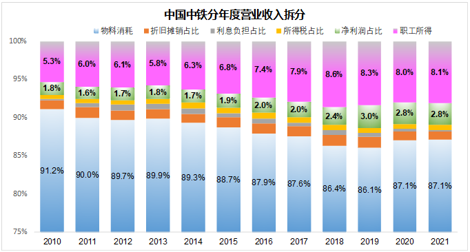 我们以中国中铁为例 (不选中国建筑因为公司房地产业务比例太高) ,从过去12年的数据看,员工薪酬在营业收入中的占比一般在10%以下,利润率比较薄,通常不到3%。