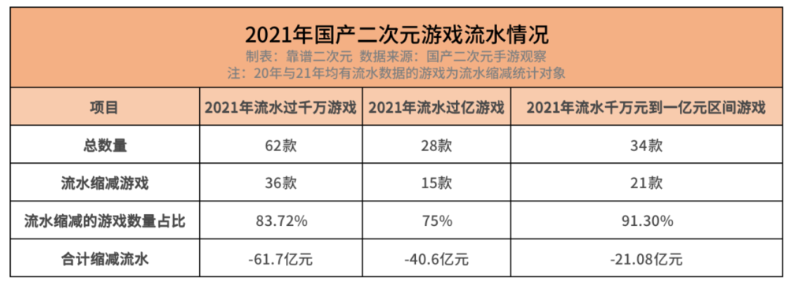 新游戏表现不给力,老游戏也在慢慢步入衰退期。把2020年和2021年均有流水表现的游戏作为统计对象,就会发现,在各个流水区间内,2021年较2020年,流水缩减的游戏数量占比均超过7成。