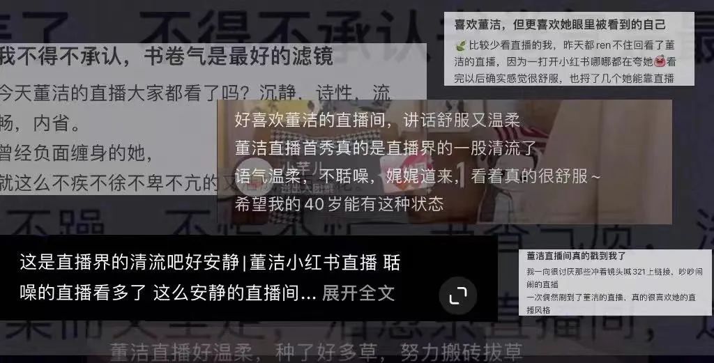 其实“潘董复合”风波后的这第二场直播,成绩不如董洁的首秀,放在行业里更是不能打。但小红书里突然涌现出一大批“自来水”,用高度雷同的文案猛夸“董洁直播间是清流”“岁月静好,娓娓道来”“书卷气是最好的滤镜”。总而言之,反复强调董洁直播与大家熟悉的抖音、淘宝直播的差异化。