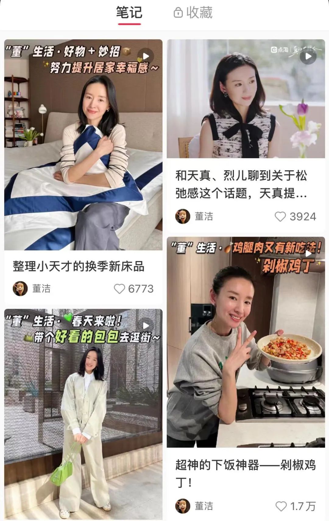 董洁2021年入驻小红书,女明星里不算早的。她围绕“董生活”主题创作视频,粉丝增长速度也比较缓慢,远不敌虞书欣、赵露思等当红小花。今年初,董洁开始尝试直播带货,以总销售额5000万的成绩空降小红书带货榜带一,可惜仍无人在意。