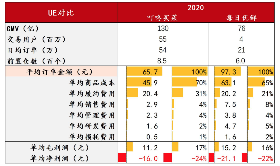(每日优鲜和叮咚买菜UE模型对比。数据来源:浙商证券)