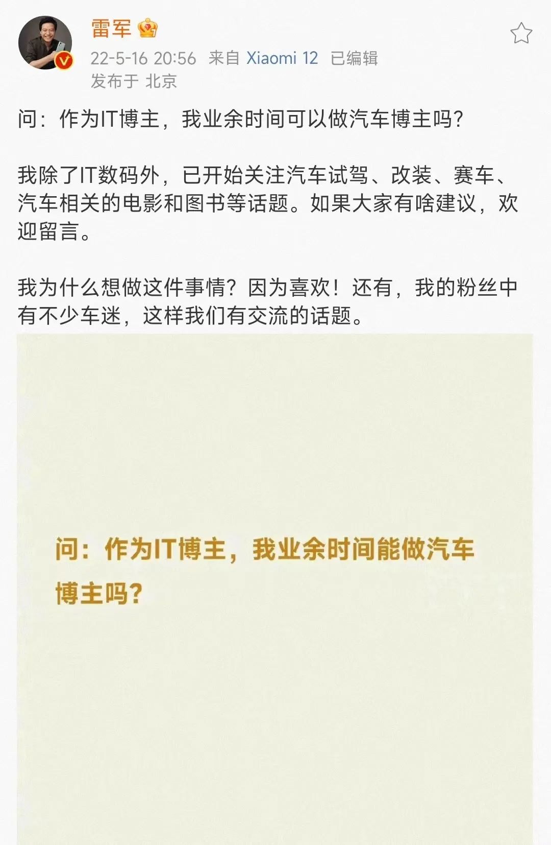 本周一晚,雷军突然以“作为IT博主,我业余时间可以做汽车博主吗?”为题发了一篇博文,**他还表示“除了IT数码之外,也开始关注汽车试驾、改装、赛车、汽车相关的电影和图书等话题”,并且邀请网友向他提建议。 **