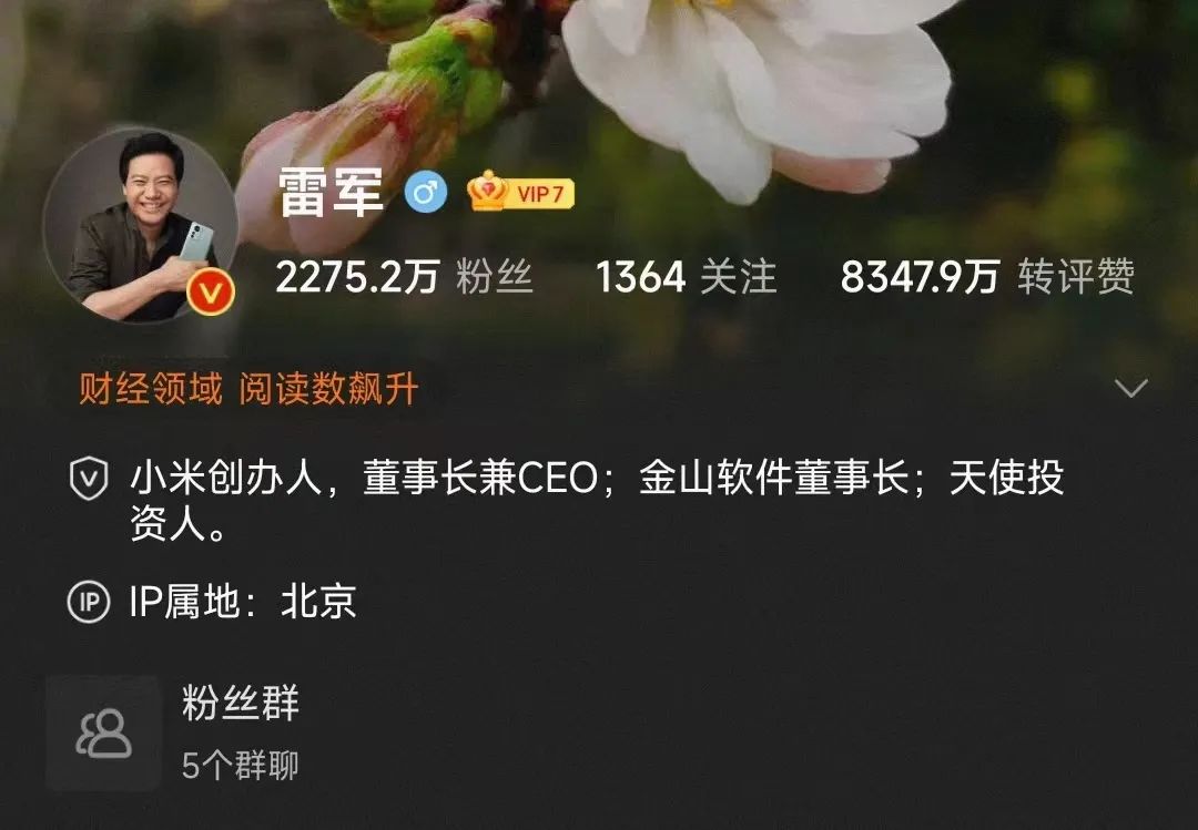 翻看雷军个人微博,首先引入眼帘的就是2275多万的粉丝和超过8300万次的转评赞等数据指标,微博对其的标注是“热门财经博主”,可谓是妥妥的顶流KOL级别。