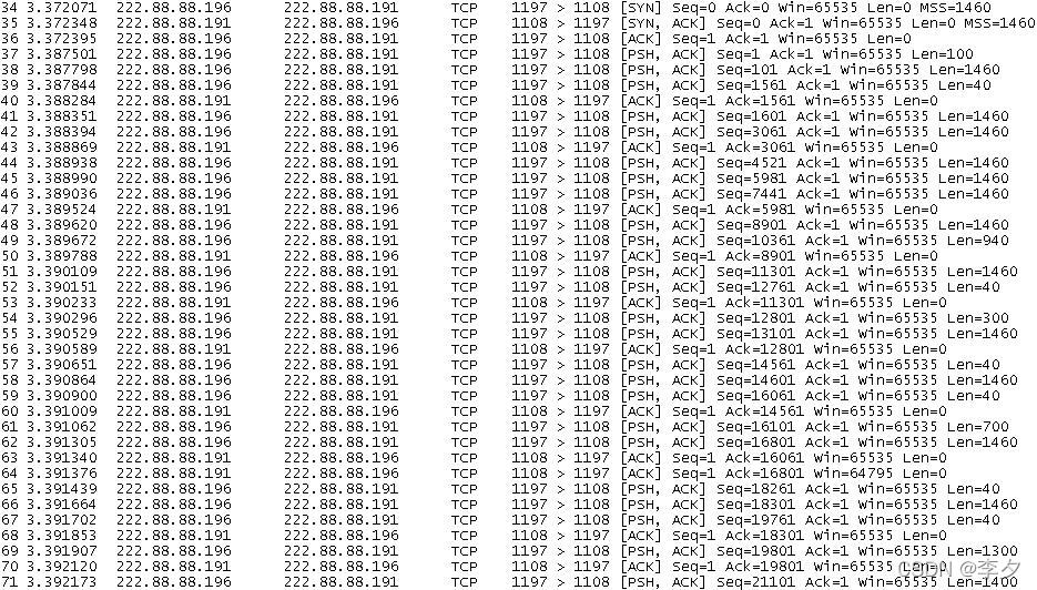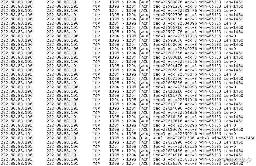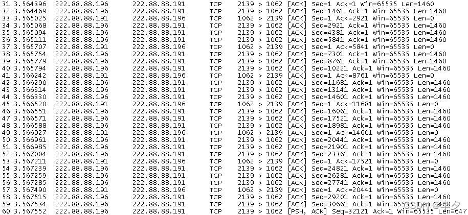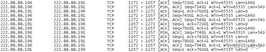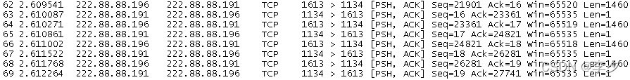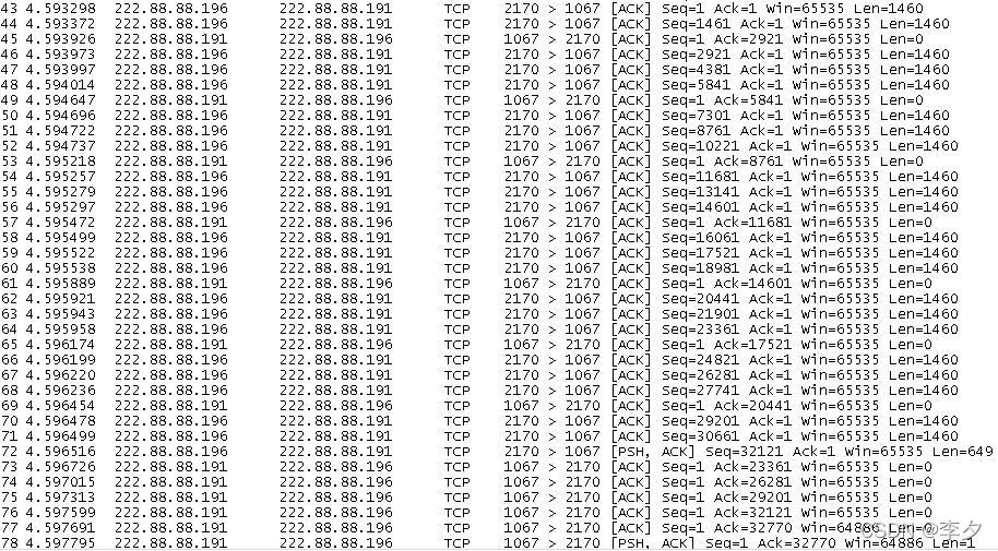 我们可以看到,传输的规律与7300Bytes时基本相同。上图是完整传输一个32767B数据的过程截图,后面的数据段传输情况和这张图上所显示的相同。但是这个值,其实是一个临界点,文件大小超过这个值后,传输过程又将会有不同。