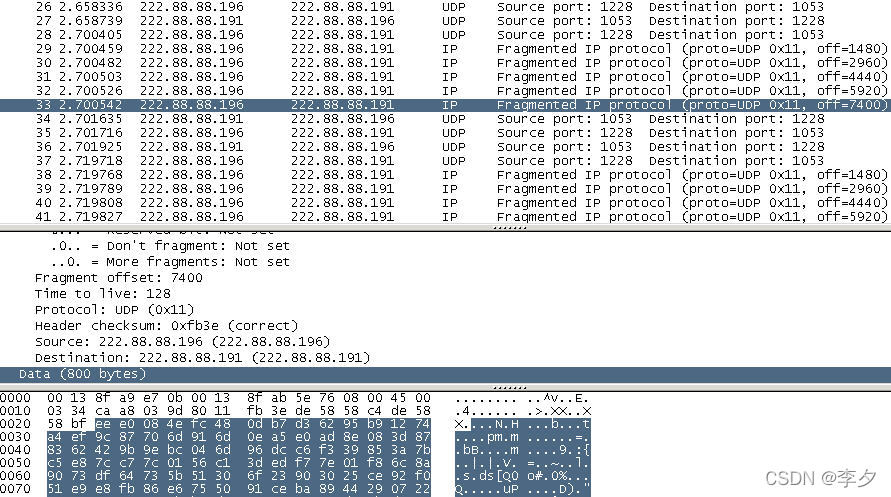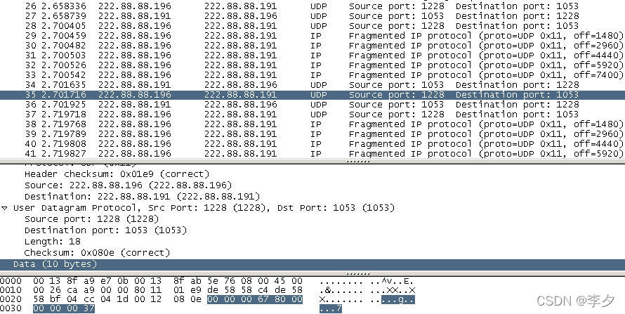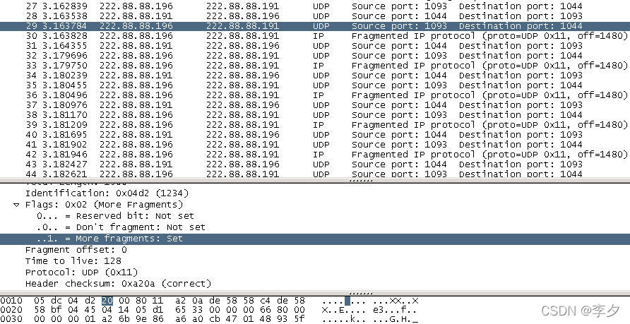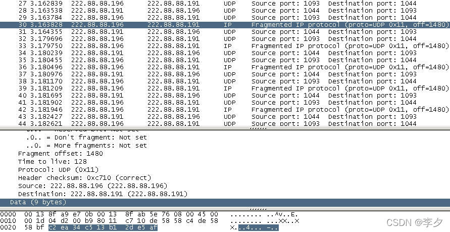 从上图中我们可以看出,发送数据的前面两步与文件大小为1400bytes时相同。原本可以传输1472bytes数据的数据报由于要传输9bytes的计数数据,所以1472bytes的数据本身就要进行分片,通过上面的截图我们可以清晰的看到more fragment位被置为了1。
