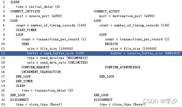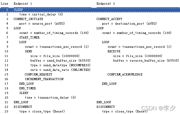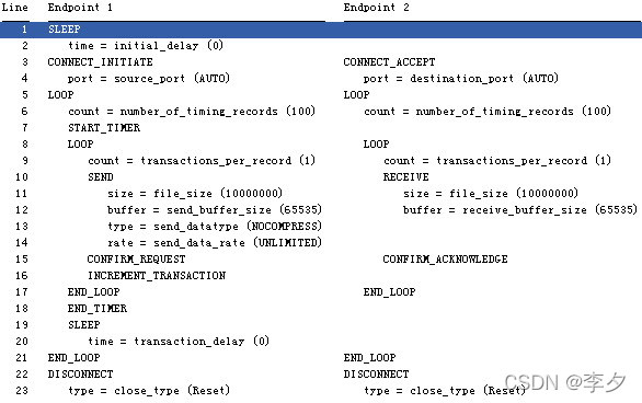 通过这些变量的设置,我们可以模拟出很多种不同情况下的测试环境。在一个内循环的最后发送端会发送确认请求,接收端会发送确认回复来结束一次Transaction。接下来进行下一次的Transaction。一个Transaction传送一个file size规定大小的文件。当Transaction的次数达到内循环变量count设定的值时,外循环就记录一次Timing record,直到记录的Timing record达到了外循环规定的记录次数则一次测试结束。(在非规定测试时间模式下),当我们规定了测试时间时,外循环这一项所设置的数值就自动被忽略了。