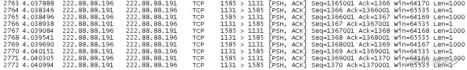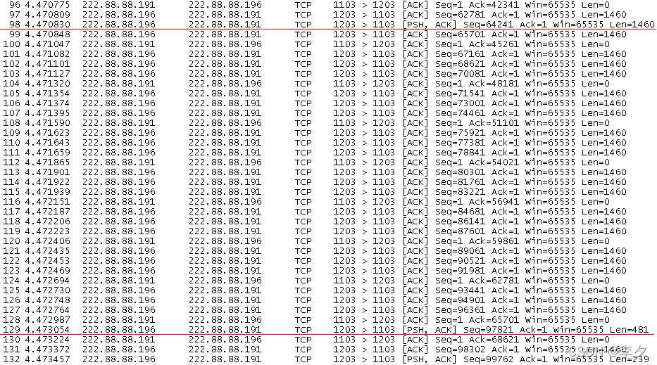 这张图展示了100k的数据段是如何被分割开来传输的过程。在传送数据为481Bytes的那个数据段之前一共有67个数据段传送了数据为1460Bytes的数据,即1460×67=97820。97820Bytes的数据已经传送完毕,由于这个截图是在数据传输开始截得的,所以前两次在32767Bytes倍数分界点时传输的都是1460Bytes的倍数,所以才能够传输67个,接下来第三个32767Bytes的倍数98301Bytes时,发送端就要发送一个PSH标志了,所以97820+481=32767×3=98301Bytes,在传完100,000Bytes数据时,按规则还会发一个PSH标志,所以98301+1460+239=100,000。这样第一个100,000Bytes的数据段就传输完毕了。接下来的传输就是对上述过程的重复,只是在传输前两个32767B数据时进行文件的分割。经过试验发现,采用Chariot软件的Throughput脚本可设置的最大文件100,000,000Bytes传输时,传输的规则也是相同的。