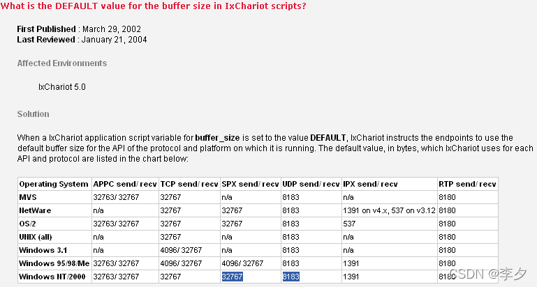 同样UDP也是这样的情况,经过测试发现,结论是一样的。在使用UDP传输时,软件的默认值为8183B。在上面的对Buffer size的设置中,没有列举将receive buffer size改变后的情况。实际情况是这样的,当改变receive buffer size的大小后,文件并不会在所设定大小的位置分开接收或者发送。在receive buffer size小于send buffer size时,接收数据方会不时的向发送数据一方发送一个表明tcp 窗口更新的信息的数据帧,这些信息的传输需要占用60Bytes,而且其中并不包含任何有效的用于计算Throughput的数据,所以这会明显的降低我们需要测试的吞吐量,由于我们研究的目的是得到最佳配置的参数,有关tcp窗口的内容在Chariot软件中无法对其进行直接的设置,所以为了避免产生tcp窗口更新的信息,在进行设置时一般将两个buffer size 的数值设置为相等的数值。虽然在软件自带的帮助文档中对default这个值的设置没有进行明确的说明,只是告诉我们这个默认值会根据协议的不同而改变,但是具体数值是多少并没有提供给我们。为了验证这一点,我在Ixia公司的官方网站上找到了相应的依据,截图如下: