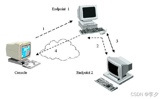 当你开始一项测试时,CHARIOT通过从控制台向每一个节点1所在的电脑发送测试建立信息来开始进行测试。下图是一个最简单的例子,使用一组Pair(节点1和节点2):