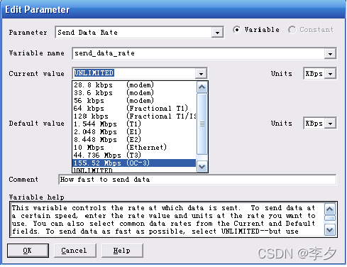 这个变量控制数据发送的速率。要采用定值来发送数据的话,输入一个你想要使用的速度值和单位。你也能够从Current和Default区域选择普通的数据速率。若要以最大速率发送数据,选择UNLIMITED模式,但是使用UNLIMITED时在流量脚本时会有警告,因为它可能在一些网络上有负面的效果。