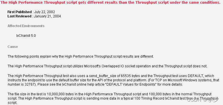 我们可以看出,两个脚本在已经设置完全相同的参数下,真正的通信过程依然是有差别的。上图中的最后一帧是按照65535B进行了分开传输。图中只是截取了整个传输过程中的一小部分,后面的传输中还有一些数据帧存在一些TCP 窗口方面的变化,但是这个情况并不影响我们问题的重点,那就是:这两种脚本即使设置了完全相同的参数,仍然是High Performance Throughput脚本的效率最高。而且High Performance Throughput脚本已经达到了测试Throughput值时可以达到的最优化设置。因为它的文件传输效率已经是理论计算的极限了。我们都知道Chariot是靠不同的脚本来对不同的项目进行测试的,那么当两个脚本设置的完全一样时为什么会出现传输过程不一样的结果呢,这个问题还需要从两个脚本本身的区别来分析,两个脚本除了buffer size和file size设置的不相同外,还有一个重要的区别,那就是High Performance Throughput脚本采用了Microsoft's Overlapped IO socket operation(微软公司的交叠IO接口控制)技术,而普通的Throughput脚本并没有使用。这一点在Ixia公司的网站上也有相关的描述。截图如下: