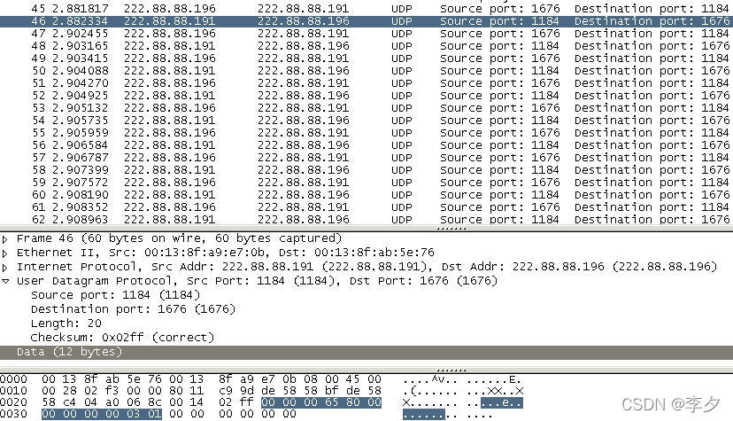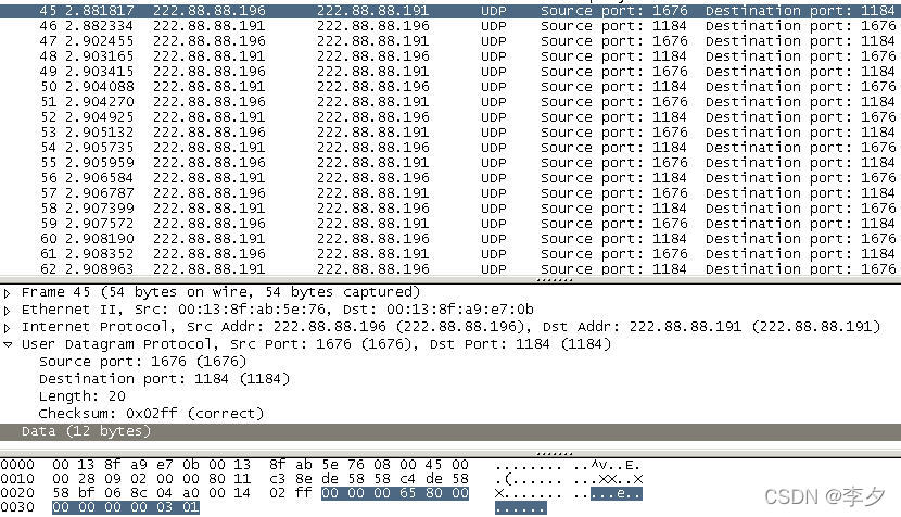 从上图中我们可以看出主机1向主机2发送的第一个数据报并不是我们要传输的数据。这个数据报的数据部分是12Bytes的一个数据,这个数据通过下面的分析,可以看出它是一个用于计数的数据。