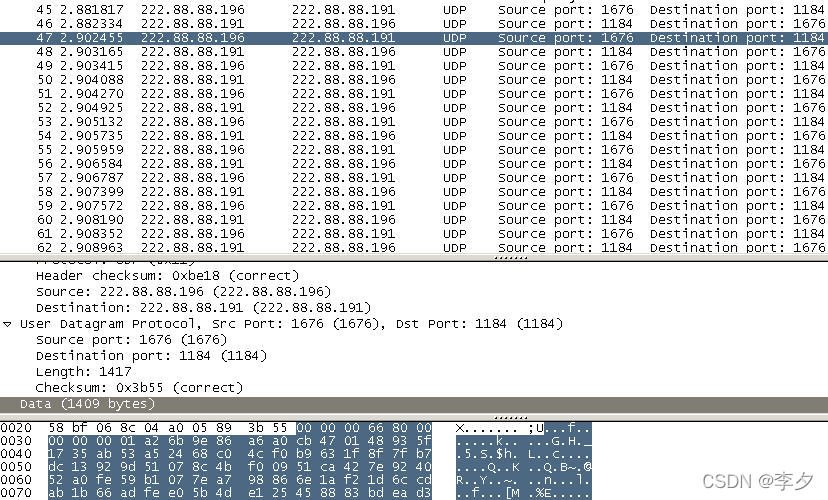 上图中的第三个数据报才是真正传输数据的数据报,但是设定的传输数据是1400Bytes而数据报部分却又1409bytes,经过观察发现这多出的9bytes的数据依然是一个用于计数的数据。