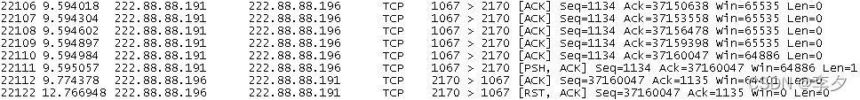 上图为TCP文件大小为32769B时,1个pair结束时的数据传输过程。我们会发现这个连接的中止是通过发送一个复位报文段(而不是FIN)来中途释放一个连接。这称为异常中止,Chariot软件的脚本中默认采用这样的方式来结束连接,也可以通过在脚本文件中修改这种结束方式。同样,这种连接的断开方式仍然与Pair数目的多少没有关系,即Pair数目较多时,每个Pair都是采用这种方式结束连接的。
