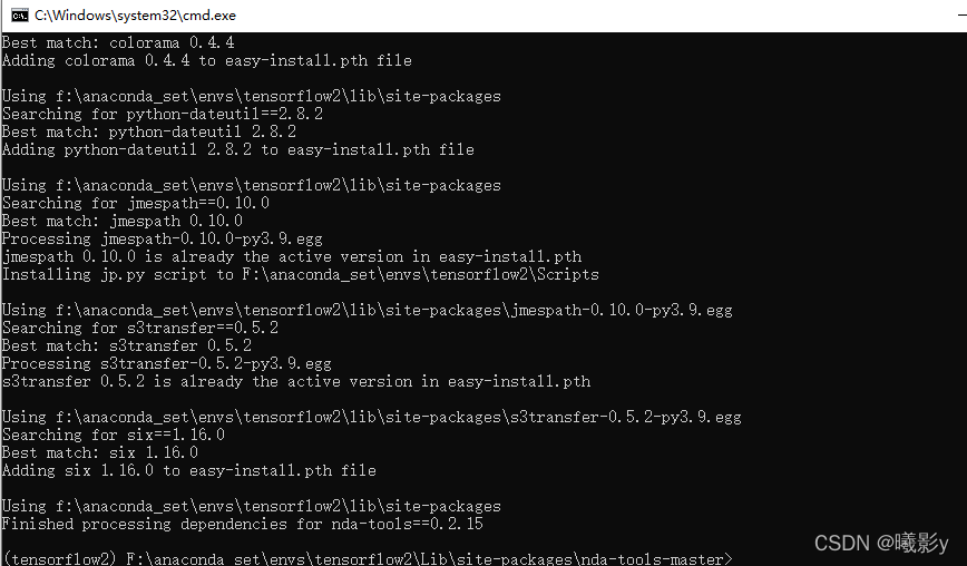 如果anaconda包含Tensorflow,PyTorch等多个虚拟环境,安装的包需要在tensorflow下使用,则安装在tensorflow的相应路径的site-pakages下,我这里安装在tensorflow下面