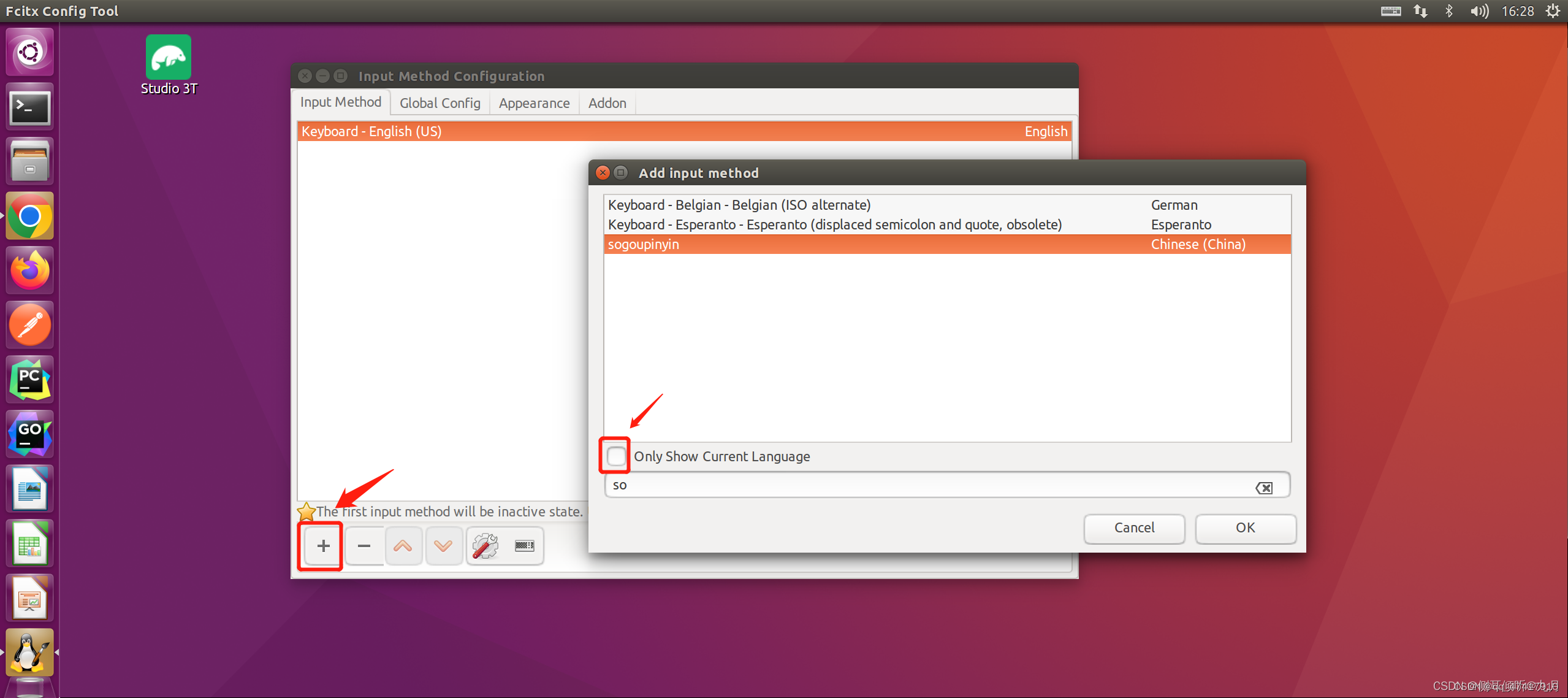 在弹出弹框中,选择“+”号,取消勾选“Only Show Current Language”, 然后搜索“so”, 可以看到sogoupinyin选项,选择确认即可。