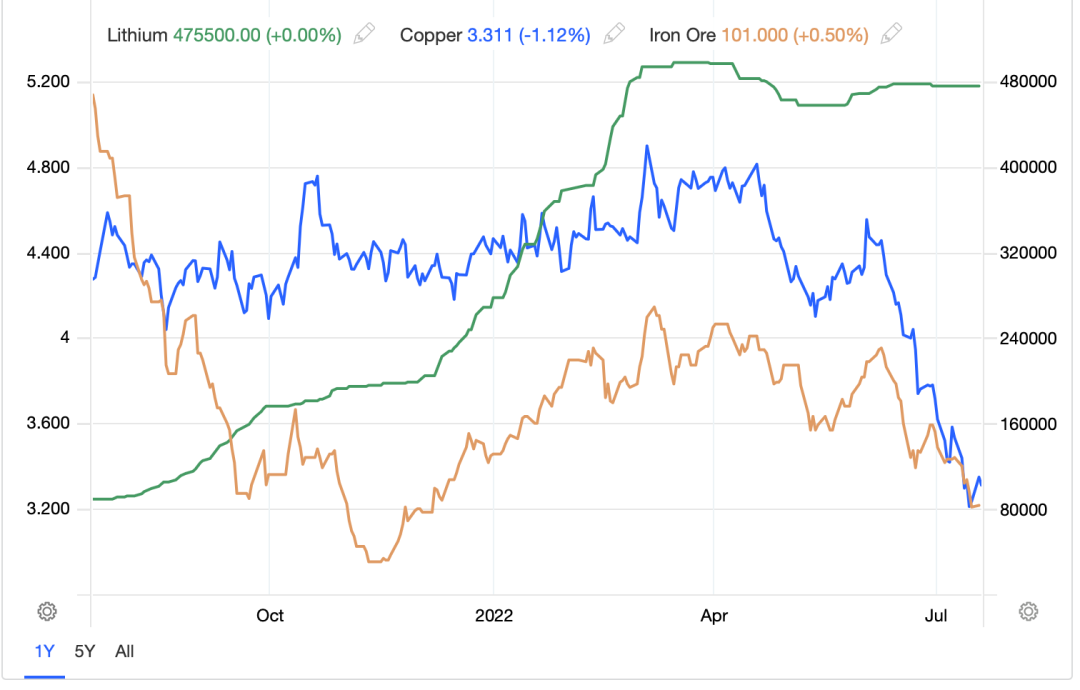 在此我们将铜与铁矿石价格,与锂电池所必需的原料“锂”价格进行对比,见下图