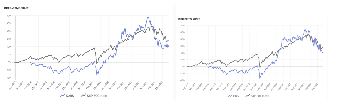 DRIV和KARS是针对新能源汽车和自动驾驶的两支ETF,与特斯拉表现几乎是一致的,自发行后至2020年表现都极为平平,都是跑输大盘,但进入2020年之后,却获得了极高溢价,此后又以均值回归之态迅速跌落。