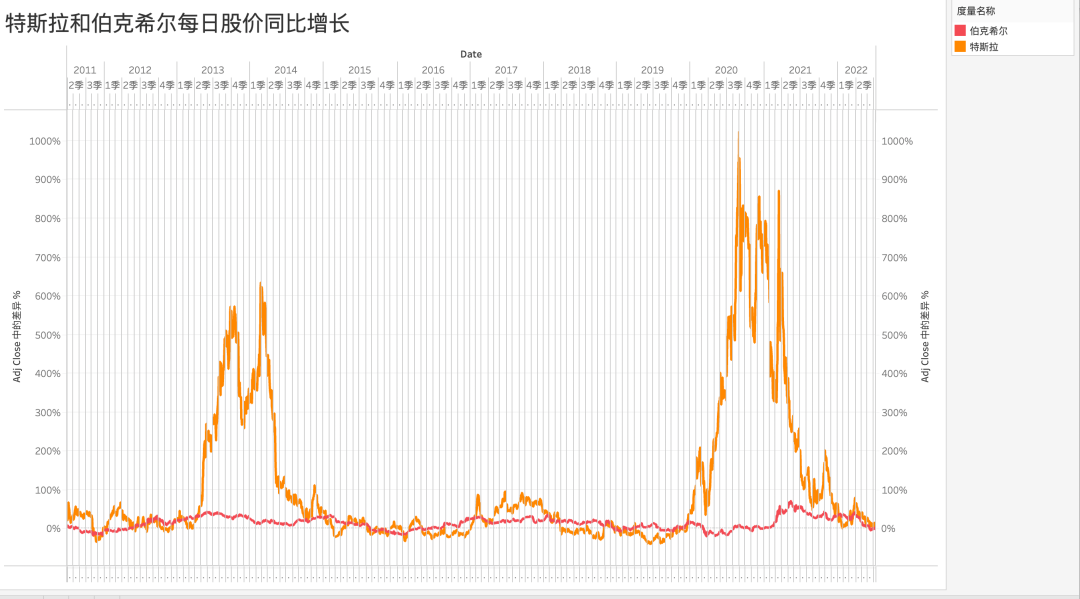 那么事实果真如此吗?我们整理了特斯拉和伯克希尔两家公司的每日股价同比增长情况,见下图