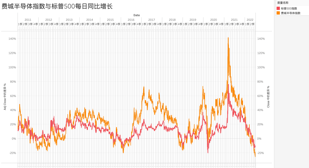 当我们对比费城半导体和标普500两大指数的走势时会发现,前者在2021年后逐渐开始跑输大盘,尽管在此之前的数年内都是跑赢的姿态。