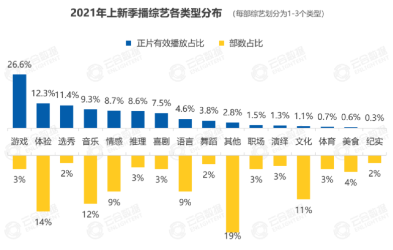 从2021年上新季播综艺各类型分布数据可以看出,音乐综艺的部数占比和正片有效播放占比相差甚远,数量不少,真正看的人却不多。