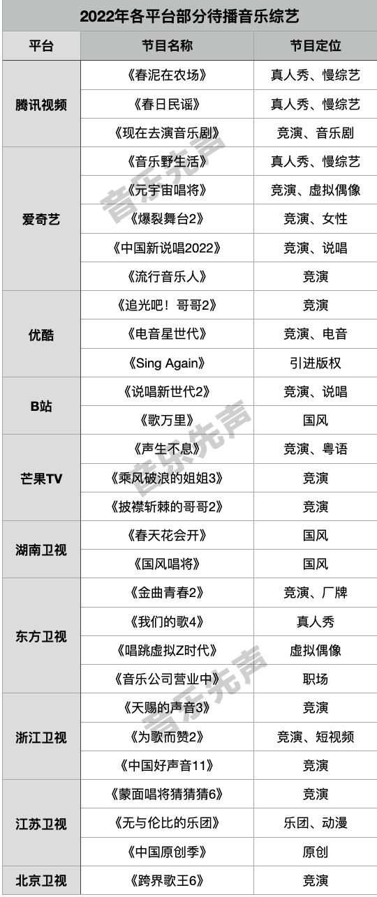 2022年已经过去了两个多月,今年还会有哪些音乐综艺?在此,音乐先声汇总了各平台的部分音乐节目,来看一看今年音综的趋势。