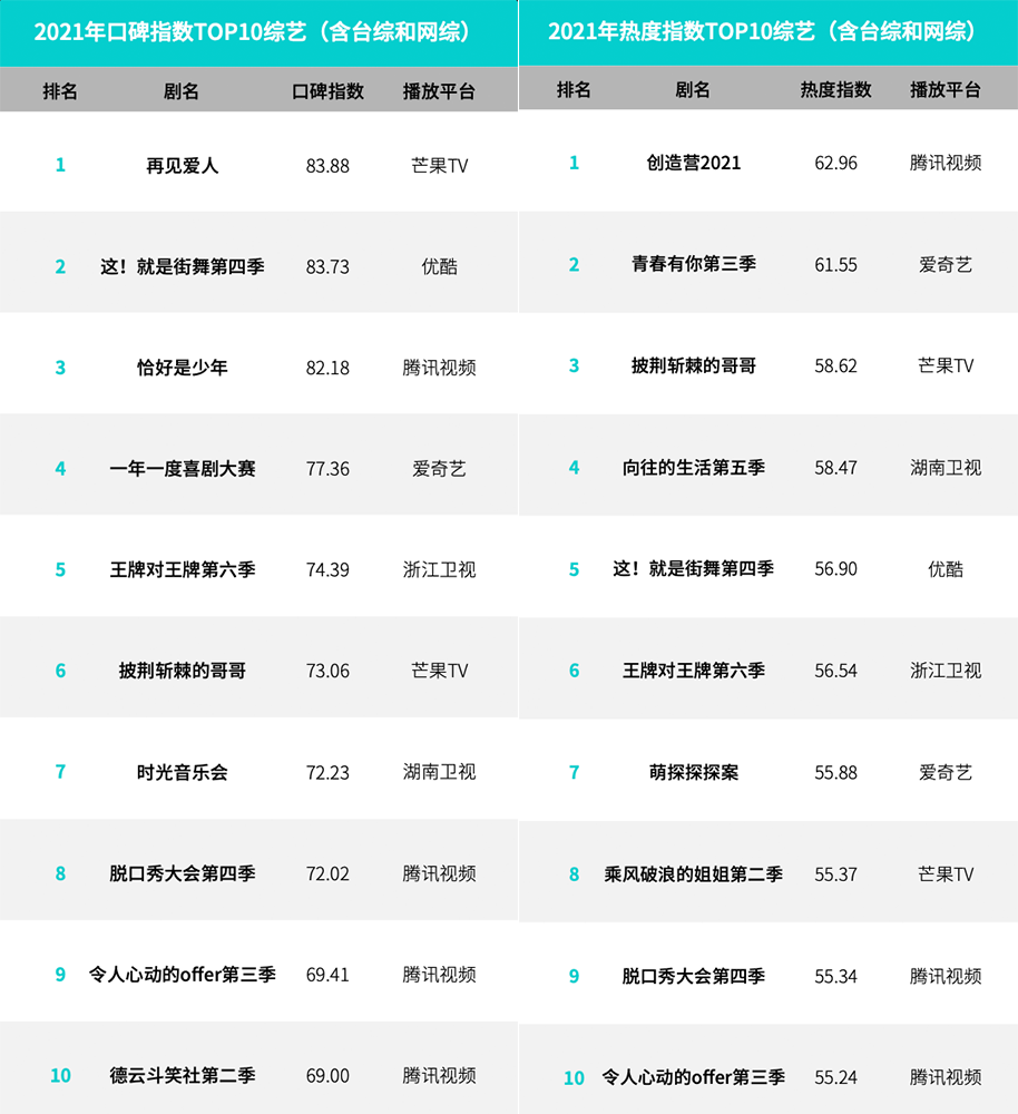 根据《2021腾讯娱乐白皮书》,在2021年口碑/热度指数TOP10综艺中,综N代由于品牌优势在热度上占据优势,但在口碑前10里,新综艺占据了一半的席位,也透露出受众对新鲜内容的渴求与期待。