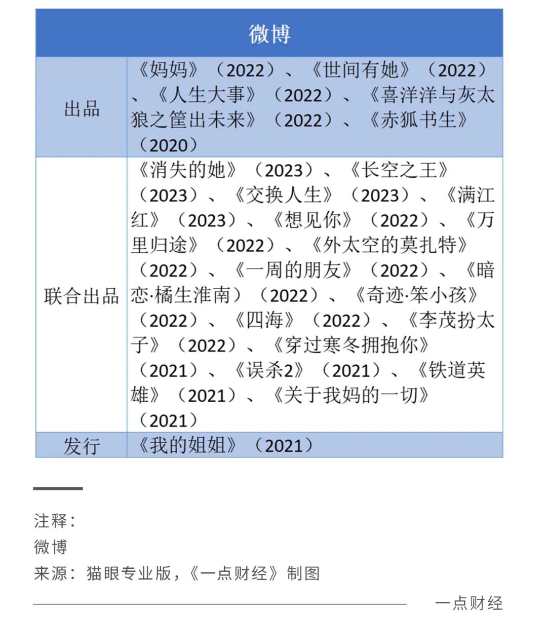 微博则是在2021年尝试了《我的姐姐》发行,2022年出品了《妈妈》、《世间有她》、《人生大事》、《喜洋洋与灰太狼之筐出未来》等作品。