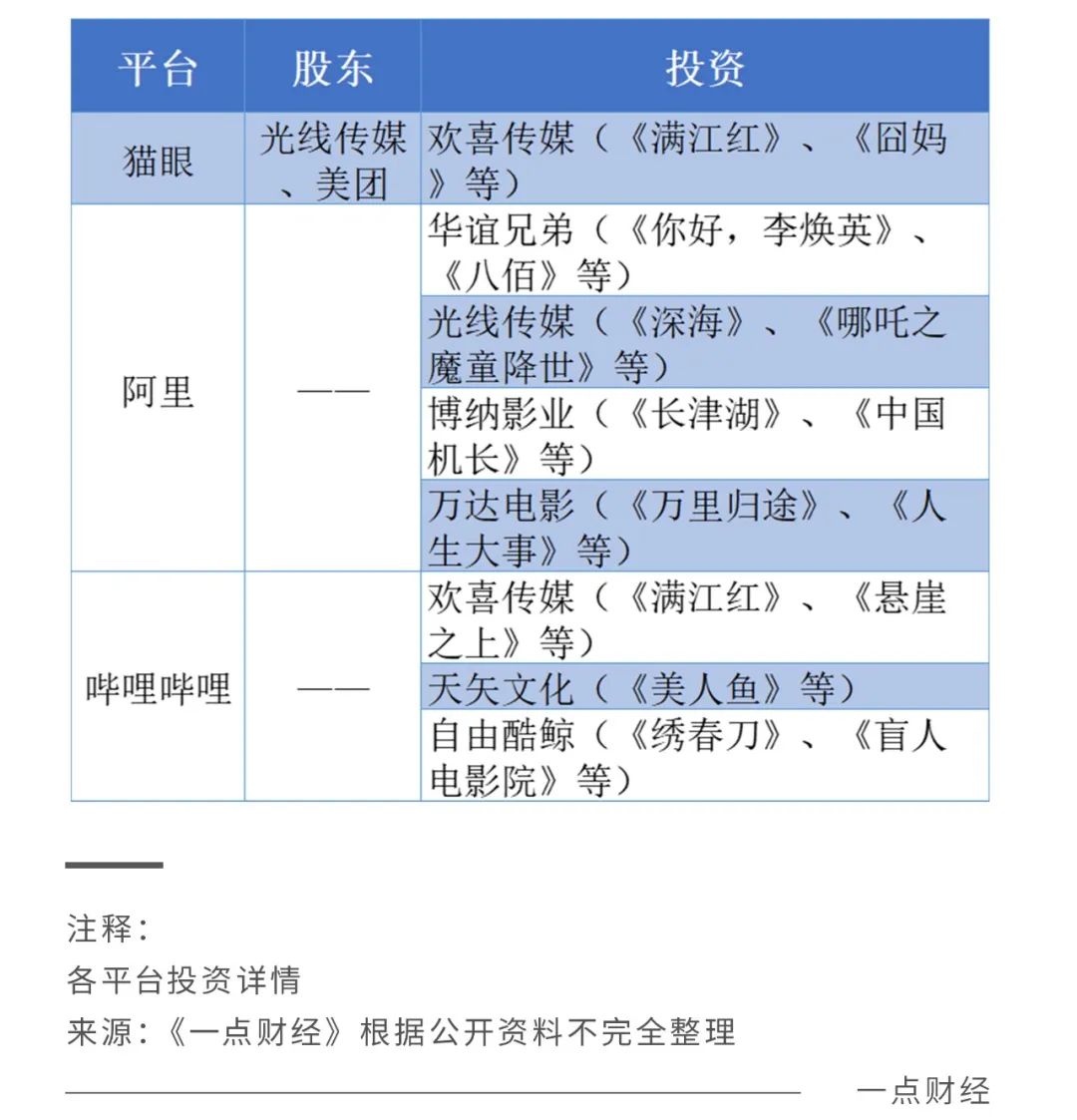 所谓“向上”,一方面是用资本砸,投资收购影视制作公司,比如猫眼、哔哩哔哩投资有张艺谋、徐峥、宁浩等导演加持的欢喜传媒,哔哩哔哩投资路阳的自由酷鲸;一方面是躬身入场,自己做出品、发行和宣传。