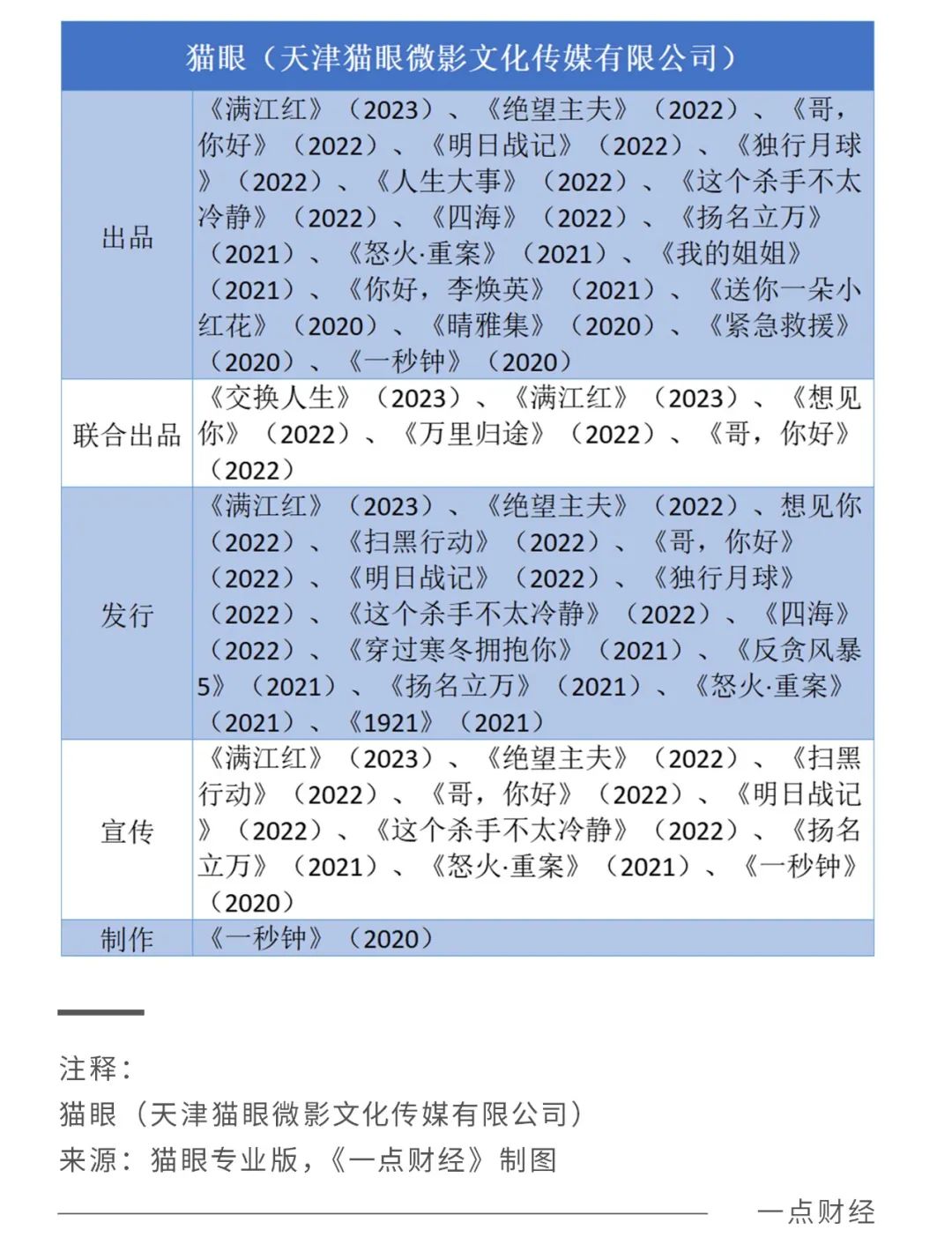 据《一点财经》统计,2018-2022年中国票房前十以及2023年春节档前二的42部电影中,有阿里影业、猫眼、淘票票、腾讯、微博(微博)、优酷猫眼、淘票票等参与的影片有37部,占比88%。