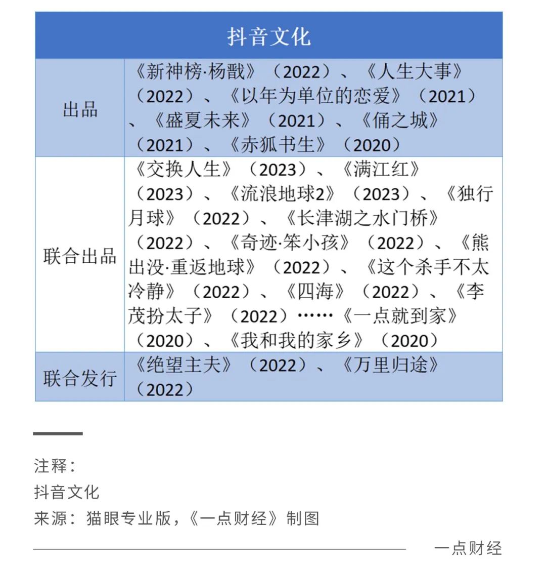 其中,抖音一方面布局票务,2021年收购票务平台“影托邦”,2022年将其更名为抖音电影票;一方面参与电影的出品、发行。2021、2022年均出品了两部电影,2023年春节档联合出品了《交换人生》、《满江红》、《流浪地球2》。