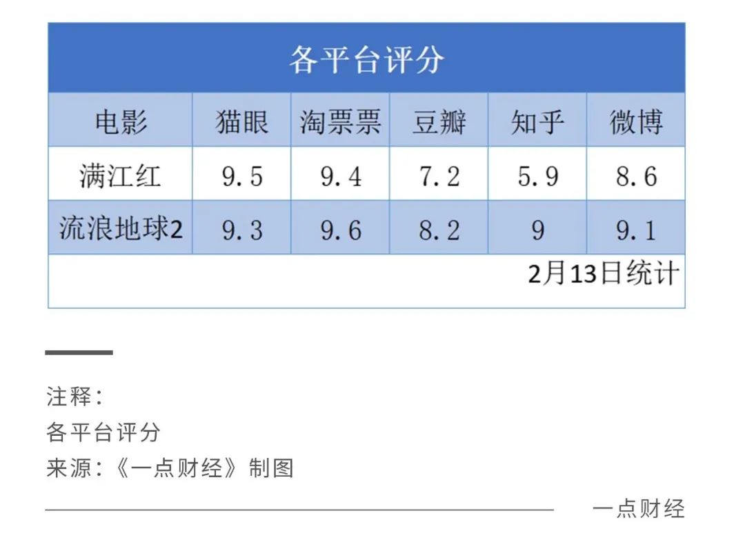 而基于各自出品、发行、宣传方的不同,同一档期的两部电影在不同平台上的评分表现也不同。以此次春节档为例,除了猫眼平台外,《流浪地球2》在淘票票、豆瓣、知乎、微博的评分均高于《满江红》,而猫眼是《满江红》的出品、发行、宣传方。