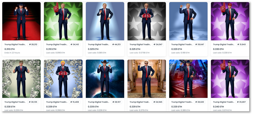 12月15日,他以个人形象发行了45000个造型各异的NFT,命名特朗普数字交易卡(Trump Digital Trading Cards),一经发行就遭到哄抢,卖出了44000个,在NFT交易平台 OpenSea 创造了761万美元的交易量,霸榜热门系列。