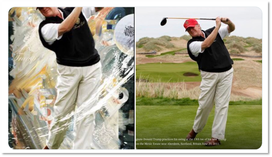 而特朗普打高尔夫球的NFT图片原型出自路透社记者David Moir ,他在2011年拍摄了特朗普在苏格兰俱乐部打球的照片。有网友指出,这张NFT中的裤子褶皱都与路透社这张照片一样,“你经过路透社批准了吗?”