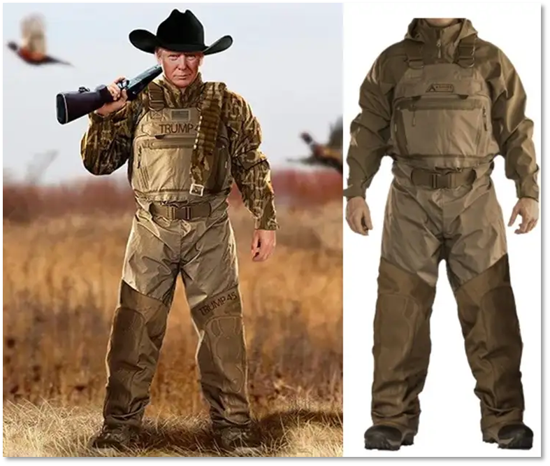 除了造型问题之外,还有网友发现,特朗普在图片中的服装似乎是从网上扒的图,一些服装图片与已有的某些服装品牌照相似。比如,特朗普穿着打猎服的NFT中,服装与狩猎服装公司Banded制作的涉水服、涉水鞋非常相似,这身装扮可以在电商网站亚马逊或eBay上直接搜索到。