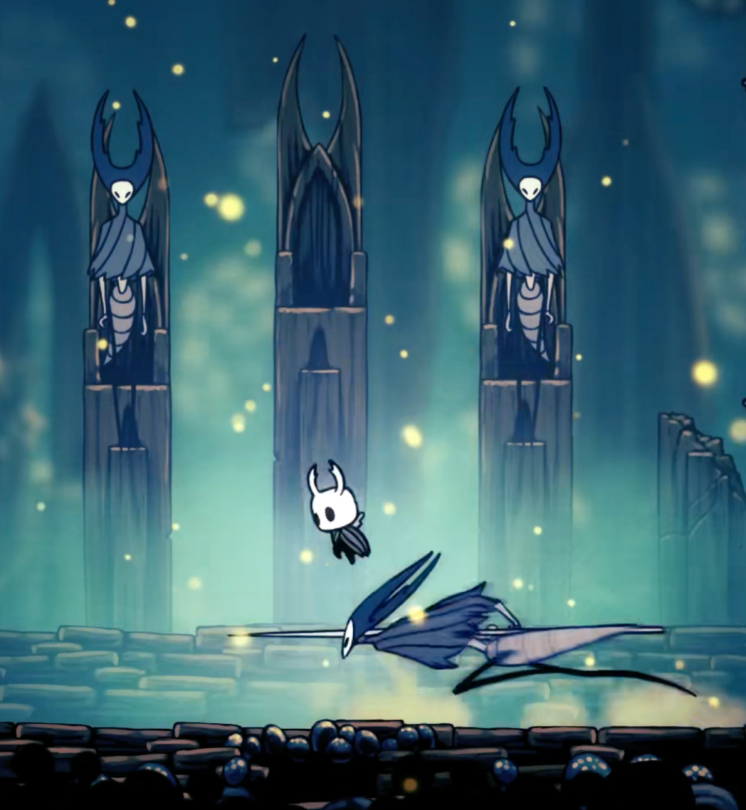 所谓“三螳螂”的正式名称叫“螳螂领主”。这是《空洞骑士》中一场声名斐然的战斗,以铿锵的设计美感而著称。