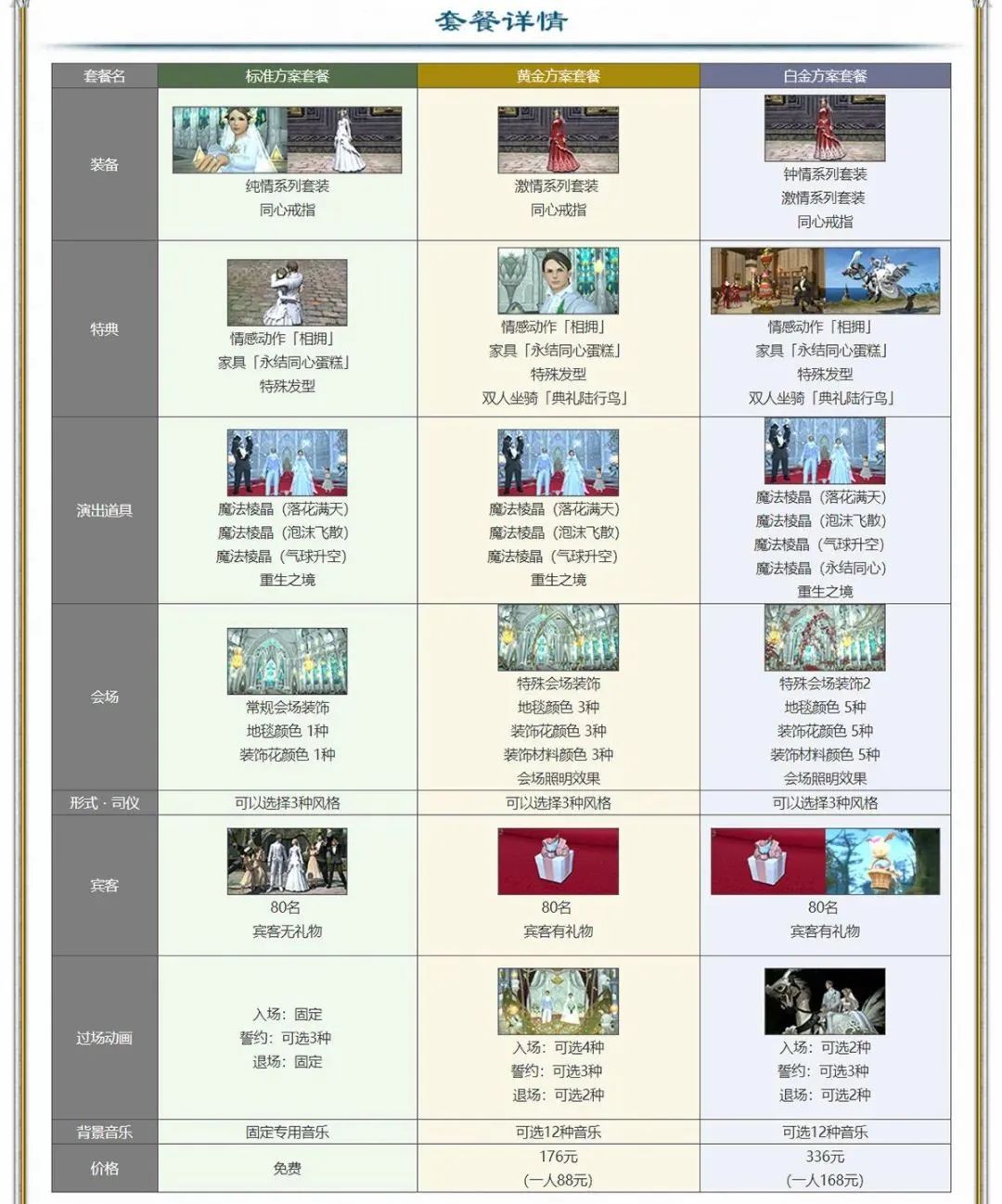 免费的标准方案、176元的黄金方案、336元的白金方案,它们的区别包括套装(华丽的婚纱)、情感动作、家具、双人坐骑、会场布置、过程动画甚至背景音乐。不仅如此,典礼会场的预约开放时间也分档位,每周五下午,白金套餐用户最早开始预约,黄金得晚一小时,免费的则再推迟一小时。