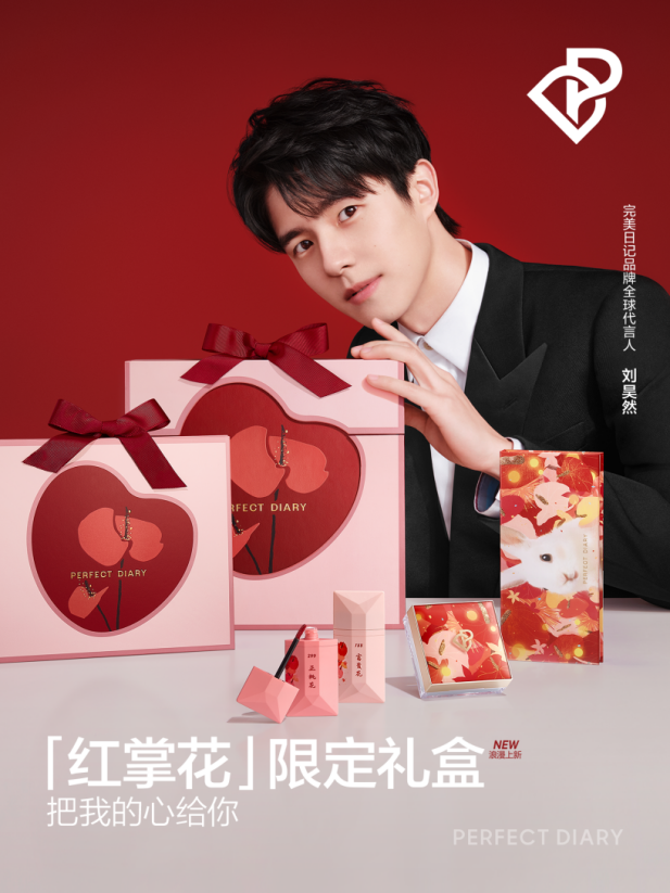 完美日记也携手品牌全球代言人刘昊然,推出「红掌花」限定礼盒,将红掌花与心形象结合,精心打造红掌花心形设计礼盒,爱心的套盒外形搭配浓郁鲜艳的花瓣颜色,借助“燃烧的心热情似火”花语,展现出恋人之间炙热如初的浓烈爱意。