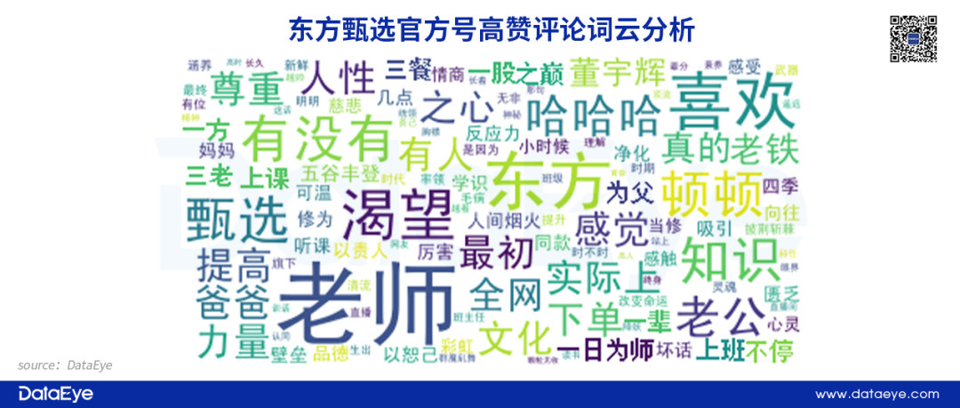 受众为何行动?从内容获客力来看:DataEye研究院认为,直播间用户并非是为商品埋单,而是为董宇辉的个人经历埋单;用户并非对商品有强烈需求,而是出于对主播个人的同情、认同、敬佩、欣赏的情绪,利用购买商品的行为实现打赏——商品只是媒介,东方甄选的本质,不只是简单的消费行为,还有围绕主播经历和价值主张的打赏行为。