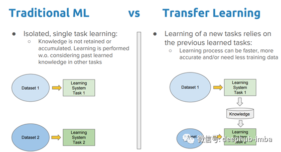 传统的ML用于为提供的每个任务/域创建单独的模型。没有保存模型的知识库。迁移学习过去有一个知识库来存储针对特定任务/领域训练/利用的模型。此外,我们可以使用相同的知识来训练新模型。
