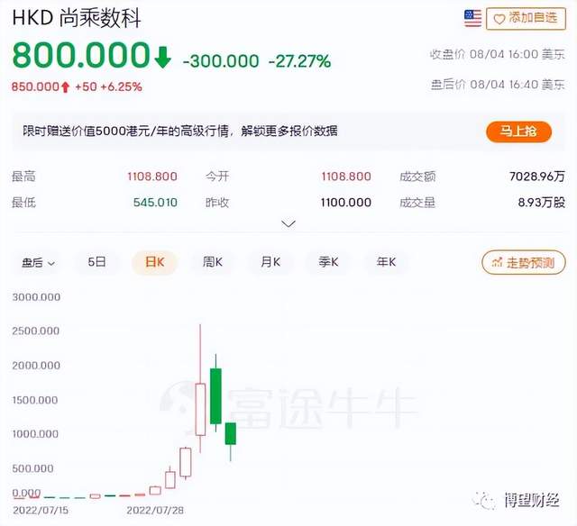 8月3日,盘中尚乘数科依旧迈着“六亲不认”的步伐继续大涨,涨幅超20%,但随后就紧急“刹车”,闪崩下挫,最高跌幅41%,触发熔断,当日收盘价1100美元/股,跌幅34.48%。次日股价继续回落,报收800美元/股,跌幅27.27%,盘中跌幅更是一度高达50%,但较发行时仍涨102倍。