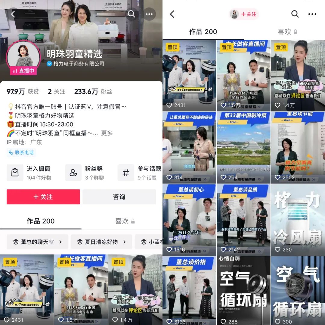 本月初,格力旗下“明珠羽童精选”的抖音账号变更头像,由原本的董明珠和孟羽童的合照,换成了董明珠单人照。