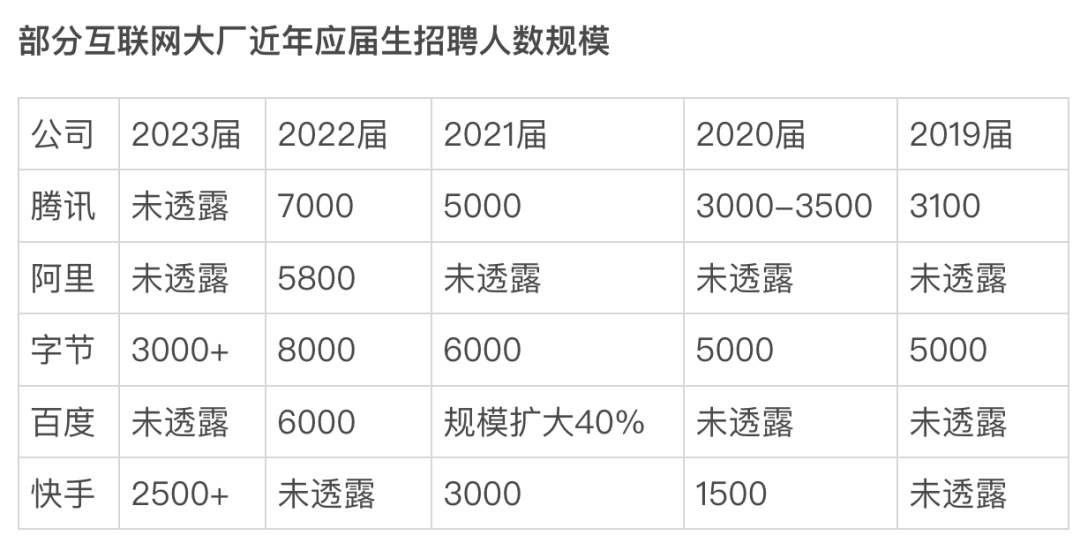 据悉,2023届秋招,字节招聘岗位从去年8000+降至3000+,阿里秋招比较晚,8月18日才开放岗位,没有对外公布具体岗位数,但不少秋招群里猜测的HC(人员编制)数据是500+。巨头们的秋招人数几乎创近五年来规模新低。