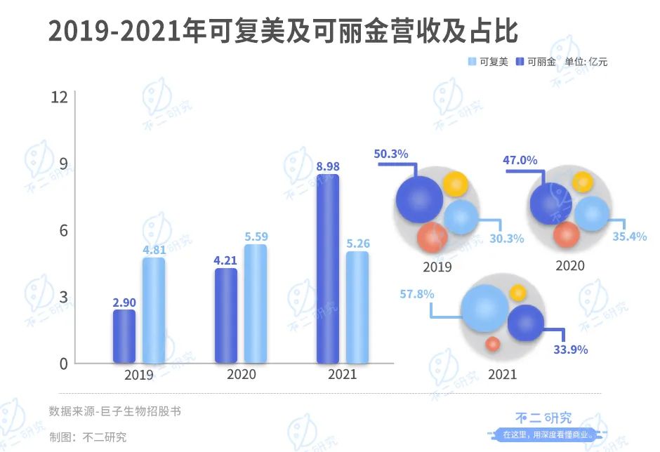 在2019-2021年,尽管巨子生物的营收平稳上升,但其对单一品牌的依赖程度较高。以2021年为例,巨子生物营收为15.52亿元,其中来自可复美的收入为8.98亿元,当期营收占比57.8%。